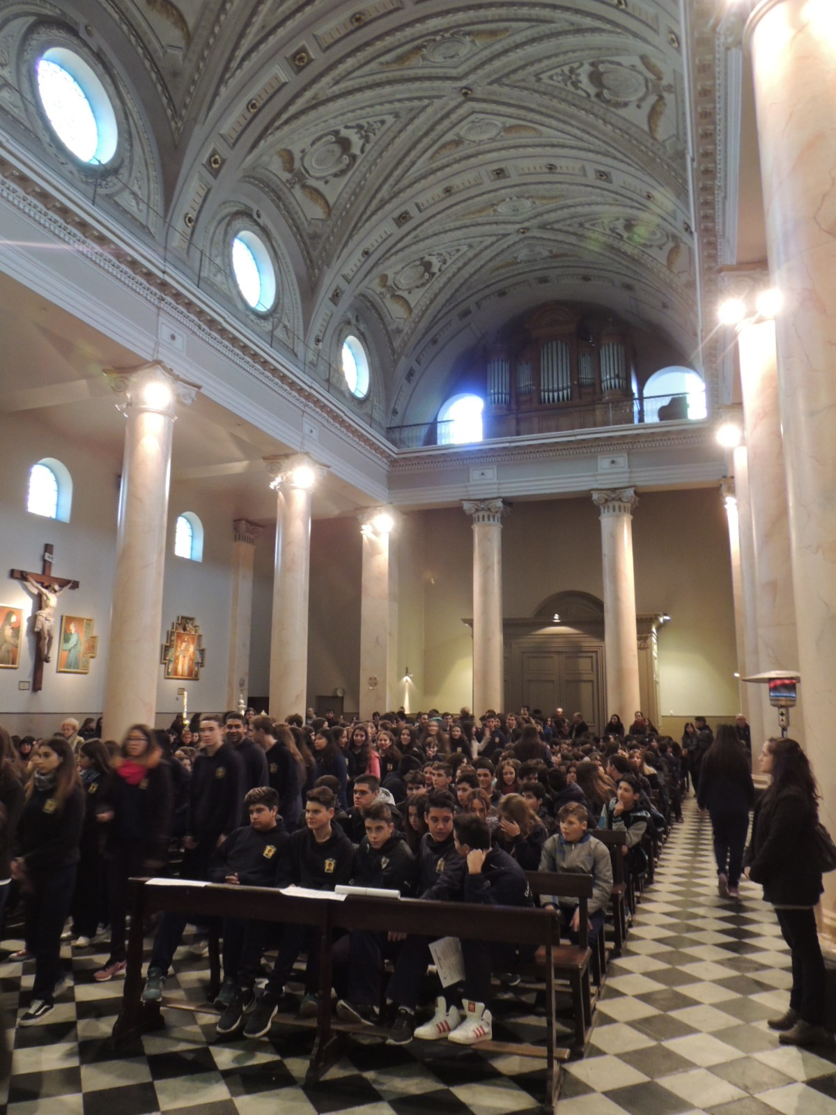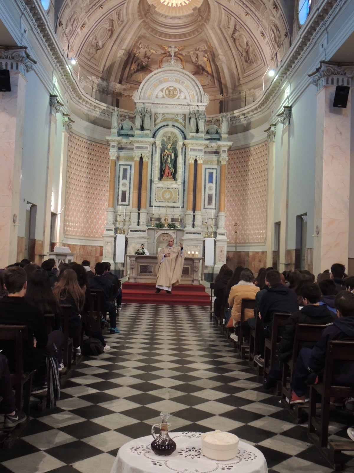 Luego, todos los docentes y funcionarios juntos, participaron de la Misa en el templo parroquial. En esta ocasión nos acompañó el Padre Fabián Silveira, Vicario de Educación de nuestra arquidiócesis. En la Misa tuvimos la oportunidad de pedir y agradecer por todos los acontecimientos y situaciones vividos personal y comunitariamente en este último año. Luego de la Misa y de la tradicional “foto de familia”, nos dirigimos nuevamente al Colegio, al Salón Hermano Avelino.