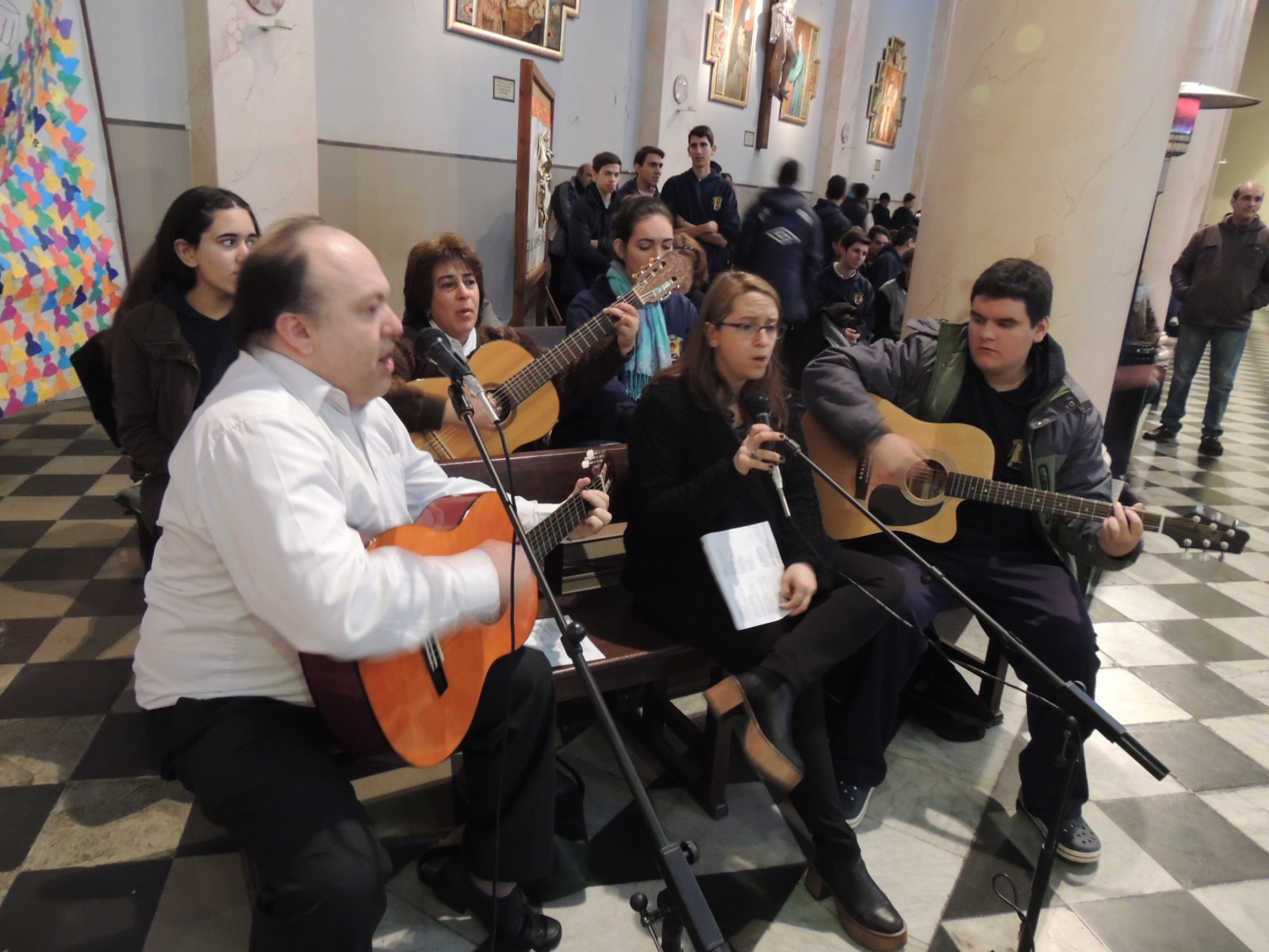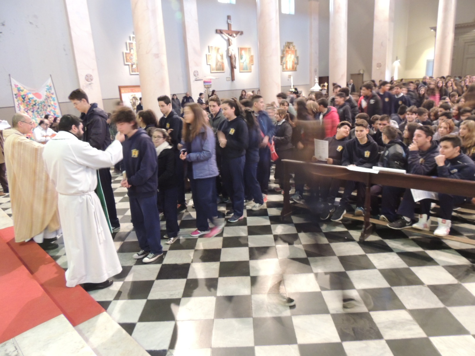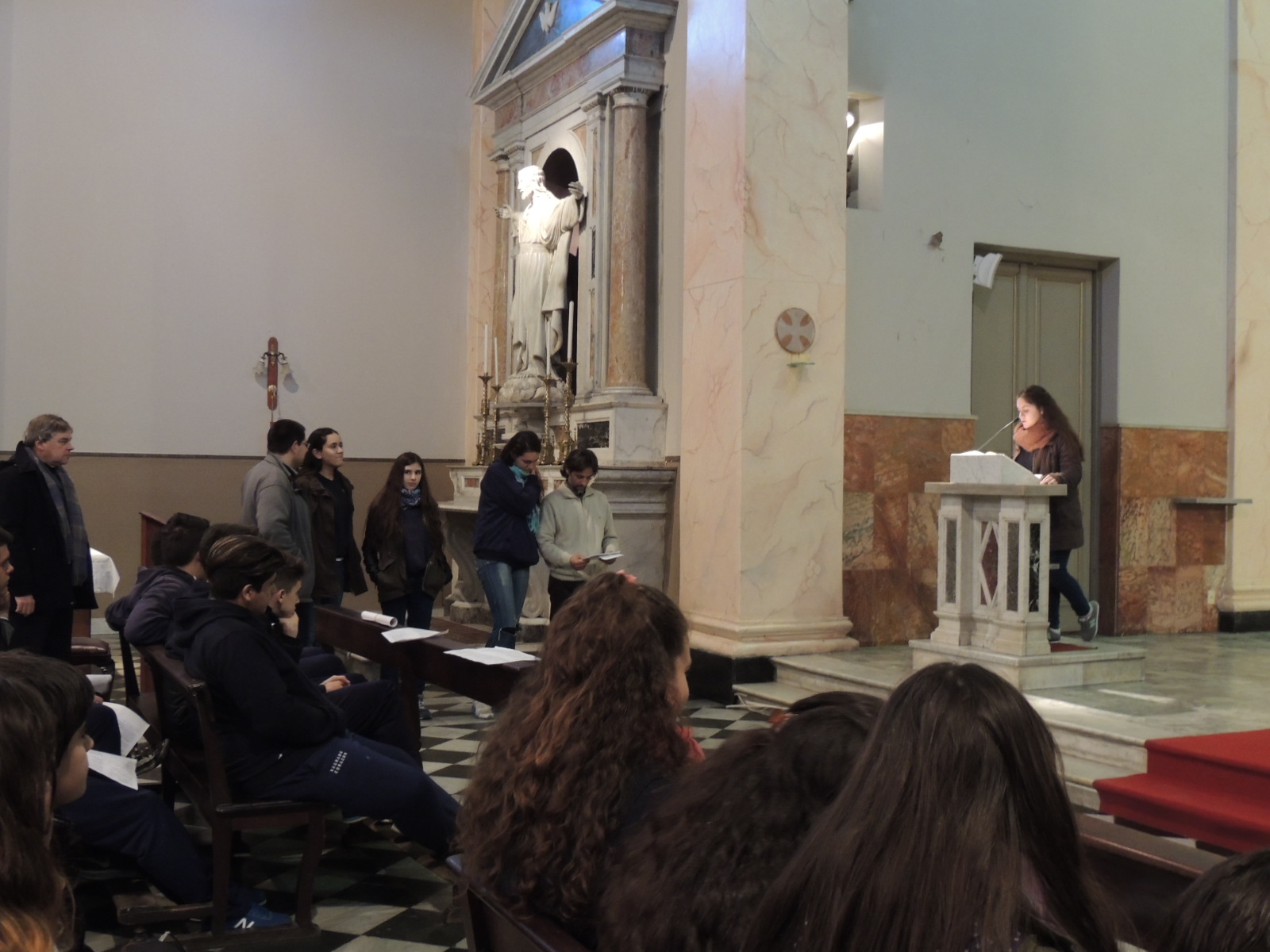 Comenzamos la mañana del viernes 3 de junio con la bendición de la nueva capilla del Colegio, que está ubicada en la ampliación del sector de oficinas en la planta baja del edificio de Secundaria. Allí estuvimos presentes representantes de todos los niveles y actores de la comunidad educativa: desde niños de Nivel Inicial hasta adolescentes de Bachillerato; desde un representante de los albañiles que trabajaron en la obra hasta el artista que pintó los cuadros; desde las familias hasta los docentes, funcionarios y la comunidad de Hermanos.